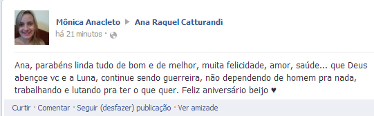 Chegou o dia mais esperado do ano pra mim. MEU ANIVERSÁRIO *-* Estou fazendo 19 anos, e eu estou muito feliz. Até ontem, eu achava que ia ser o pior aniversário da minha vida, por conta de alguns problemas e também de uma garota que quer fazer inferno da minha vida. Mas o dia já amanheceu bem. Apesar de eu ter acordado atrasada pra trabalhar, fui acordada pela minha avó, meu avô e minha pequena, cantando parabéns pra mim. Lulu até bateu palmas! ahahaha ♥ Já fiquei feliz, levantei e fui tomar um banho frio, vim pro trabalho e começaram as publicações no facebook, mensagens inbox, mensagens no celular, whatsapp e tudo mais. Fiquei me sentindo TÃO amada com as coisas que me fizeram, que eu mal pude me conter, passei o dia inteiro chorando! Foi lindo...
