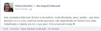Quero agradecer primeiramente a DEUS, dono da minha vida, e que me dá a oportunidade de fazer a diferença todos os dias, por nunca ter me abandonado mesmo eu sendo tão errada e as vezes muito ingrata. Por ter realizado milagre em minha vida e por ter se mostrado cada dia mais fiel! E também a todas as pessoas que gastaram minutos do seu tempo comigo, me mandando textos e textos lindissimos, fazendo montagens, homenagens, coisas lindas que dinheiro algum paga. Guardo tudo dentro do meu coração e digo pra vocês: MUITO OBRIGADA! O carinho de vocês fazem uma enorme diferença em minha vida. Agradeço também as pessoas da minha família, minha tia Carol, meus pais, minha avó, meu avô e todos, que estiveram comigo desde o começo de minha vida e nunca me abandonaram mesmo com meus erros, falhas e decepções. Que me perdoaram e que estão aqui comigo, me ajudando todos os dias a me reerguer e a realizar todos os meus sonhos. Agradecer a Luna Eduarda que tem um papel importantíssimo na minha vida, minha filha, meu amor, que me alegra todos os dias, que me faz feliz, que me faz sorrir e que todos os dias me dá novos motivos para viver. TE AMO, FILHA. Aos meus amigos, virtuais e pessoais que me aguentaram por mais um ano kkkk Sariene, Patty, Giu, Lud, Mari e muitas outras meninas que aguentaram meus choros, meus surtos, minhas loucuras e minhas alegrias sempre que eu precisava.